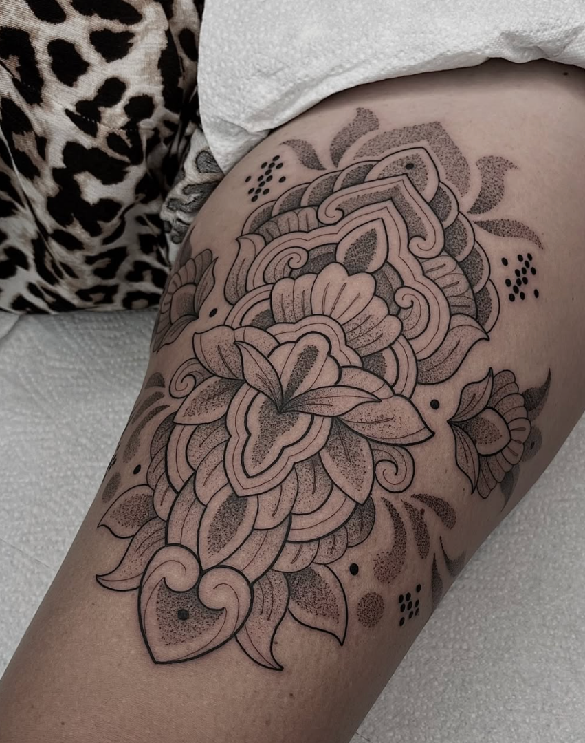 Kim macht vorallem Fineline Tattoos, Dotwork und hat sich auf Ornamentale Motive und Mandalas spezialisiert.Setzt aber auch sehr gerne Florale Designs und Tiermotive um